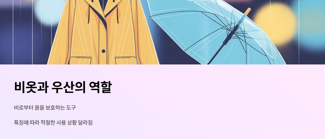 비옷과 우산은 모두 비로부터 몸을 보호하는 역할을 하지만, 각각의 특징에 따라 적절한 사용 상황이 달라요.
