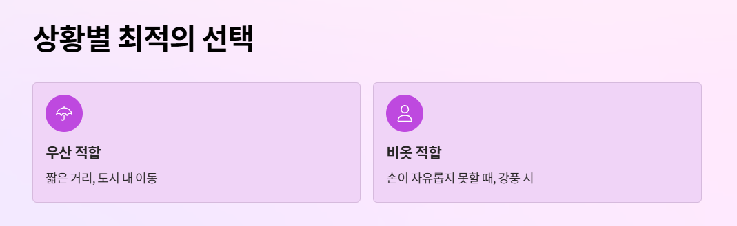 일반적으로 짧은 거리나 도시 내 이동에는 우산이 편리하지만, 손이 자유롭지 못하거나 강풍이 부는 날에는 비옷이 더욱 안정적이에요.
