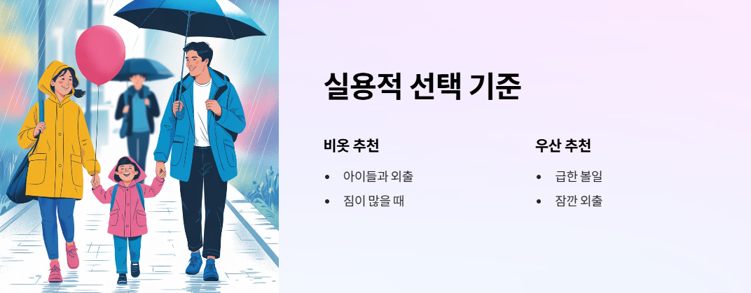 특히 아이들과 함께 외출하거나 짐이 많은 경우에는 비옷이 훨씬 실용적이에요. 반면, 급한 볼일이나 잠깐 외출할 때는 우산이 간편하고 휴대하기 좋아요.