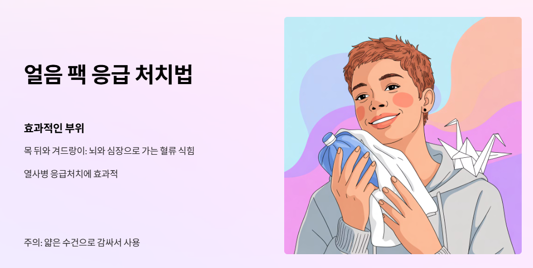 특히 목 뒤와 겨드랑이 부위는 뇌와 심장으로 가는 혈류를 식히는 데 효과적이라서 열사병 증상이 있을 때도 응급처치로 활용돼요. 단, 직접 피부에 닿지 않도록 얇은 수건을 감싸서 사용하는 것이 좋아요.