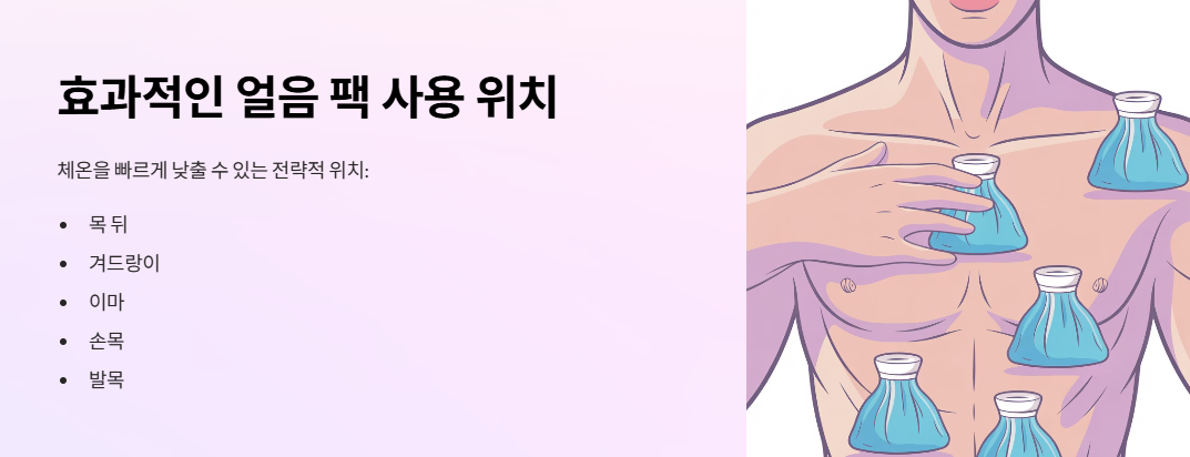 얼음 팩을 사용할 때는 체온을 효과적으로 낮출 수 있는 위치를 아는 것이 중요해요. 일반적으로 목 뒤, 겨드랑이, 이마, 손목, 발목 등의 부위는 혈관이 피부에 가까워 냉기가 빠르게 전달돼요.