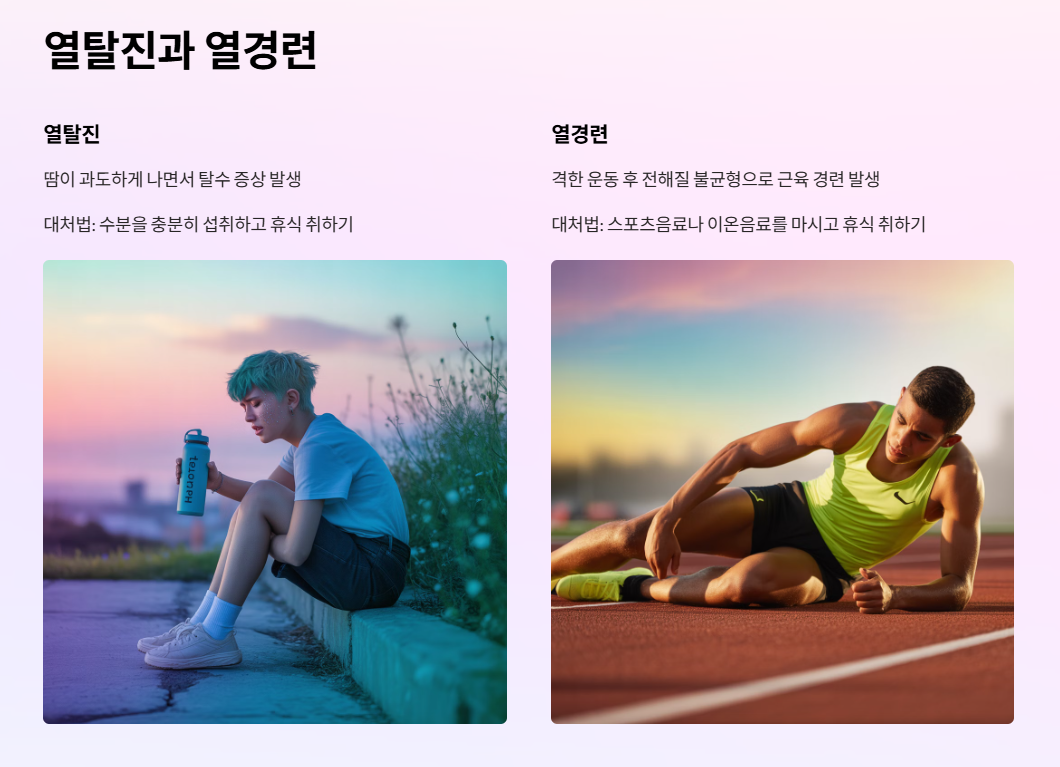 열탈진은 땀이 과도하게 나면서 탈수 증상이 나타나는데, 이때는 수분을 충분히 섭취하고 휴식을 취해야 해요. 열경련은 격한 운동 후 전해질 불균형으로 근육이 경련을 일으키는 현상이예요. 이럴 때는 스포츠음료나 이온음료를 마시고 휴식을 취하는 것이 중요해요.