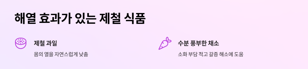 특히 해열 작용이 있는 제철 과일과 채소는 몸의 열을 자연스럽게 낮춰줘요. 수분이 풍부한 음식은 소화 부담도 적고 갈증 해소에도 도움이 되기 때문에 무더운 계절에 자주 섭취하는 것이 좋아요.