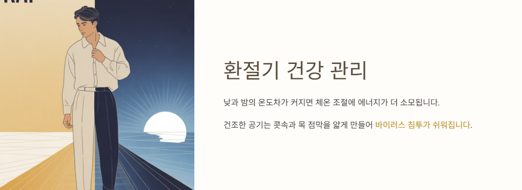 환절기에는 감기, 인플루엔자, 비염·천식 악화, 피부 건조, 결막 자극 등이 자주 나타나요. 외출 전후 체온 변화를 완만하게 만들고, 코세척이나 가글로 점막을 청결히 유지하면 도움이 돼요. 손 세정제를 휴대하고, 사람이 많은 장소에서는 기침 예절을 지키면 전파 가능성을 줄일 수 있어요. 운동은 땀을 흘리되 무리하지 않는 강도로 30분 내외로 꾸준히 이어가고, 과로 후에는 휴식과 수분 보충을 충분히 취해요. 증상이 의심되면 자가 진단으로만 판단하지 말고 필요한 경우 의료 상담을 통해 적절한 조치를 받는 것이 안전해요.