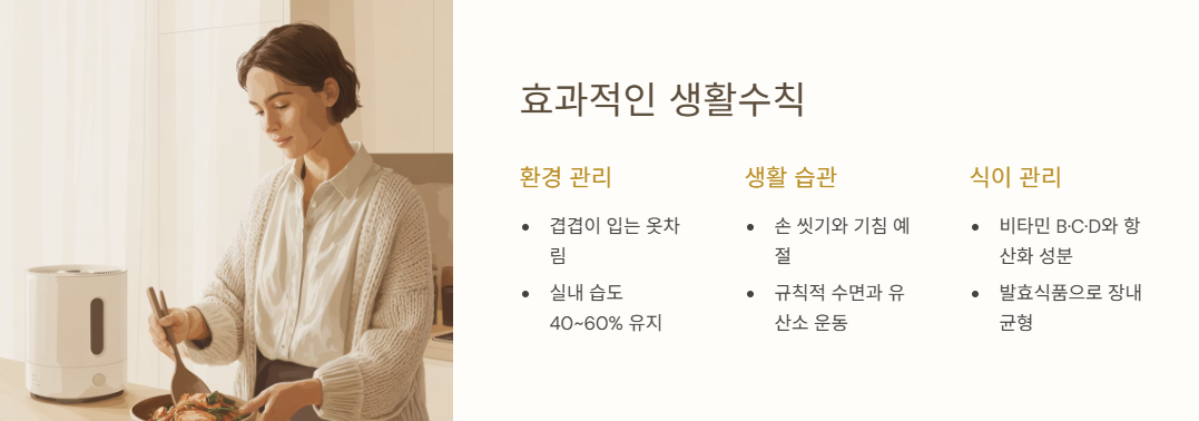 - 실천 방향: 습도 40~60%·겹쳐 입기·위생
