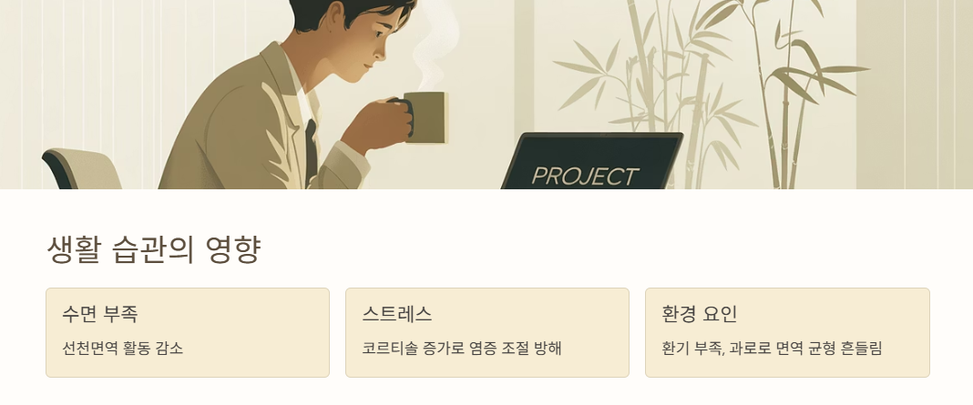 생활 습관도 큰 영향을 줘요. 수면 시간이 줄거나 수면의 질이 떨어지면 자연 살해세포와 같은 선천면역 활동이 감소하기 쉬워요. 스트레스가 높아 코르티솔이 오래 유지되면 염증 조절이 흐트러지고 회복 속도가 느려져요. 여기에 환기 부족으로 실내 오염물질이 쌓이거나 과로로 신체 활동이 불규칙해지면 면역 반응의 균형이 더 흔들릴 수 있어요. 이런 요인들을 함께 관리하는 접근이 필요해요.