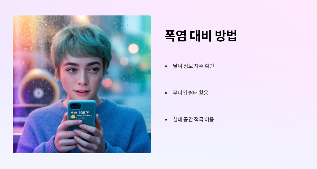 따라서 날씨 정보를 자주 확인하고, 무더위 쉼터나 실내 공간을 적극 활용하는 것이 중요해요.