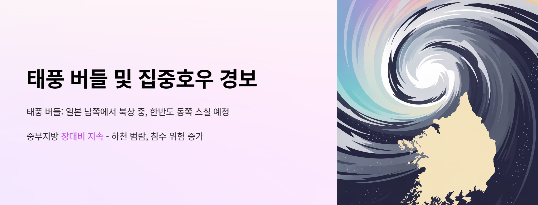 현재 태풍 버들은 일본 남쪽 해상에서 북상 중이며, 한반도 동쪽을 스치듯 지나갈 것으로 예상됩니다. 이와 동시에 수도권을 포함한 중부 지방에는 강한 장대비가 이어지고 있어 하천 범람과 침수 위험이 높아진 상황입니다. 기상청은 이번 주 중반까지 비가 이어질 것으로 전망하고 있으며, 일부 지역에서는 시간당 50mm 이상의 강한 비가 쏟아질 수 있다고 경고하고 있습니다.