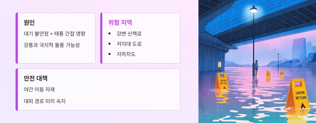 이번 폭우는 대기 불안정과 함께 태풍의 간접 영향이 겹친 결과로, 강풍과 함께 국지적인 돌풍이 발생할 가능성도 높습니다. 강변 산책로, 저지대 도로, 지하차도 등은 출입을 삼가야 하며, 특히 야간에는 시야 확보가 어렵기 때문에 더 큰 주의가 필요합니다. 집중호우로 인한 피해를 최소화하려면 미리 대피 경로를 숙지해 두는 것이 안전합니다.